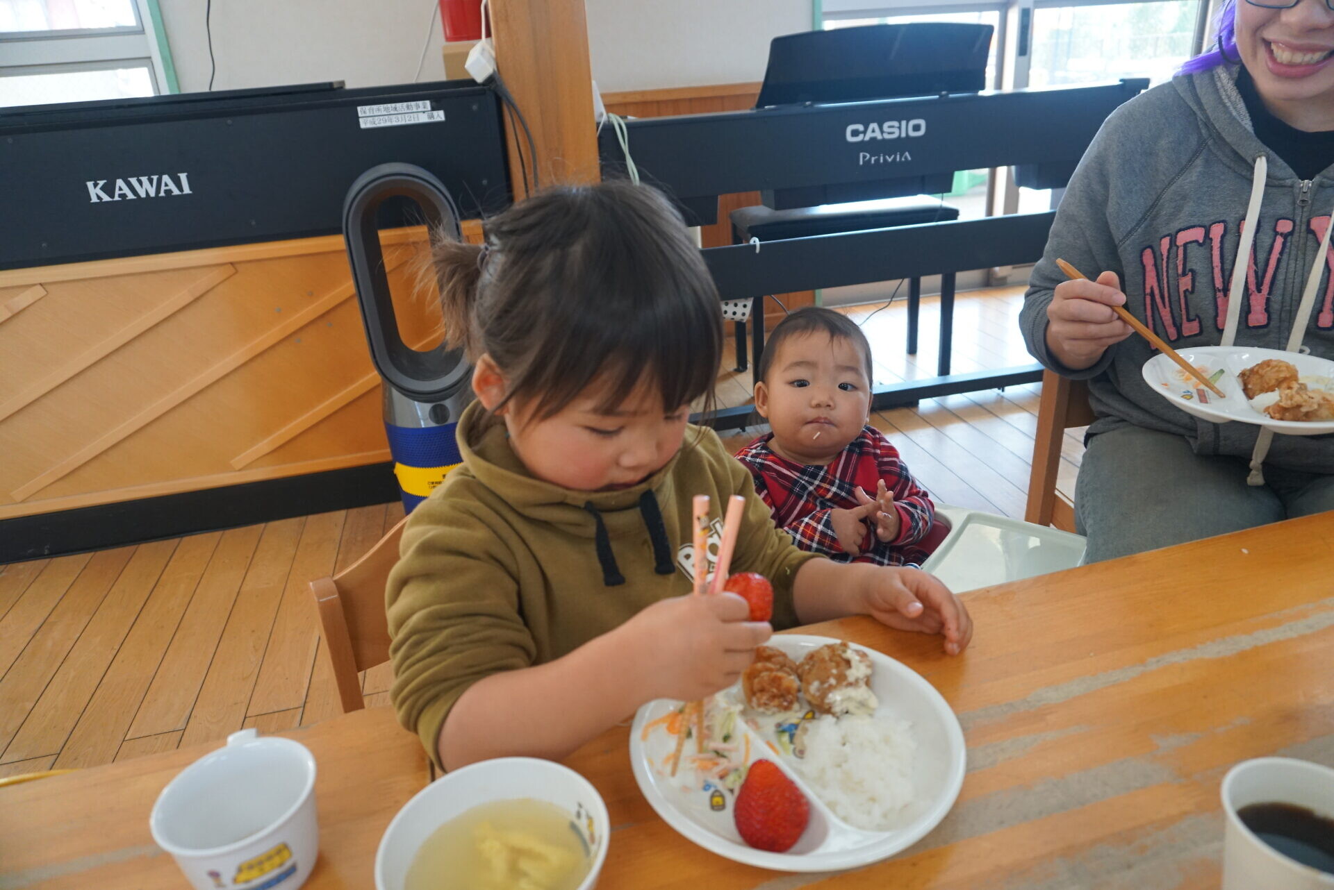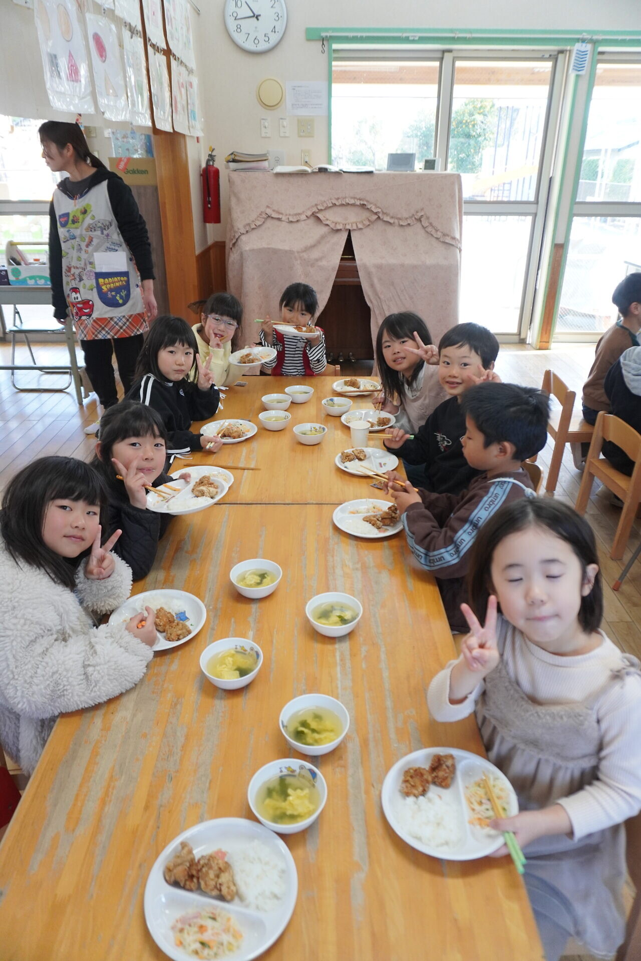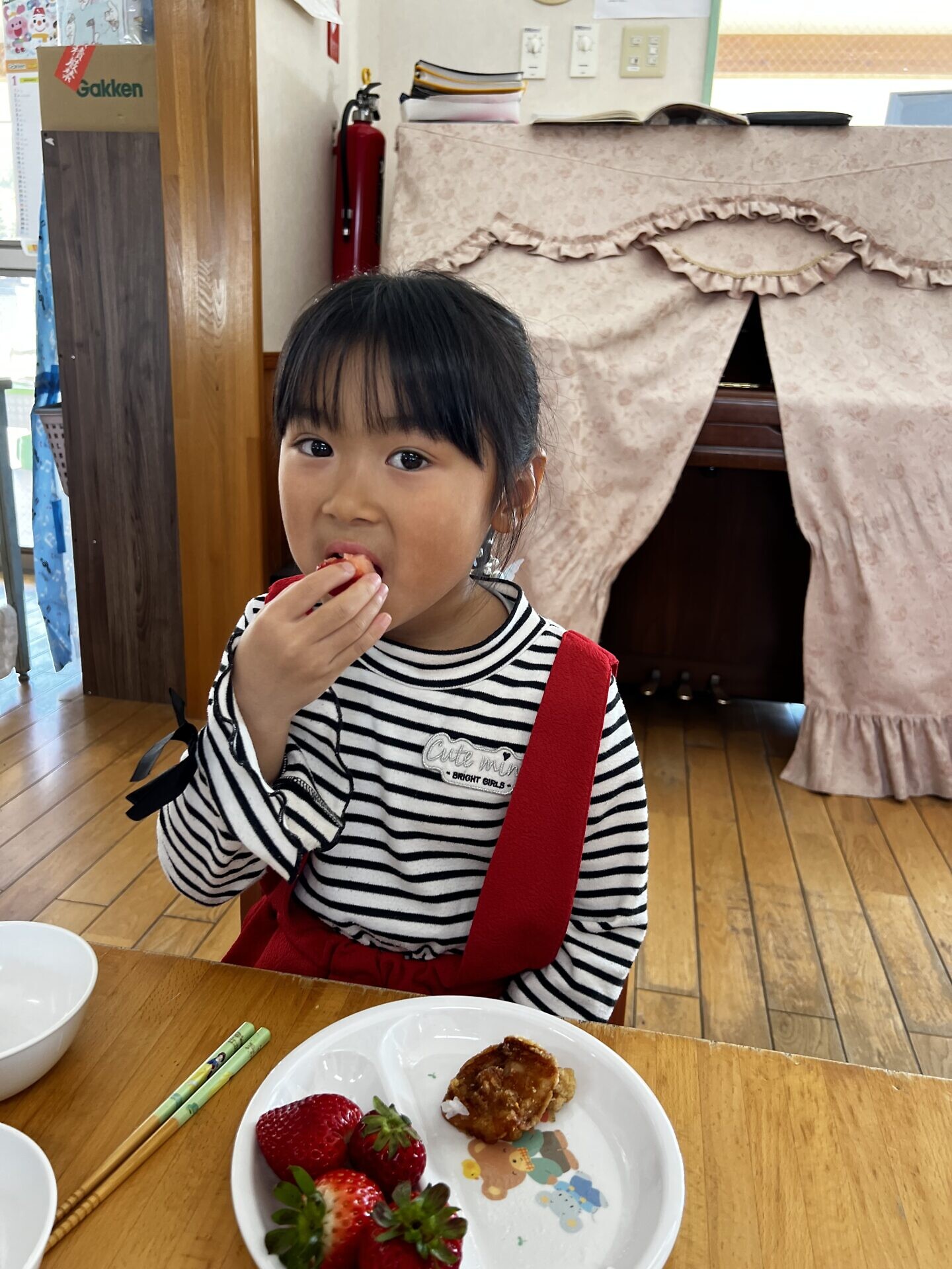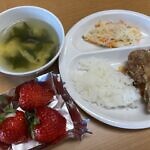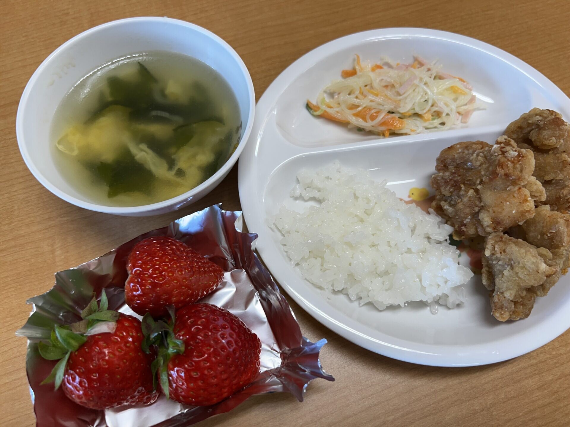 今回のメニューはみんなが大好きだったご飯、唐揚げ、シルバーサラダ、卵スープ、いちごでした