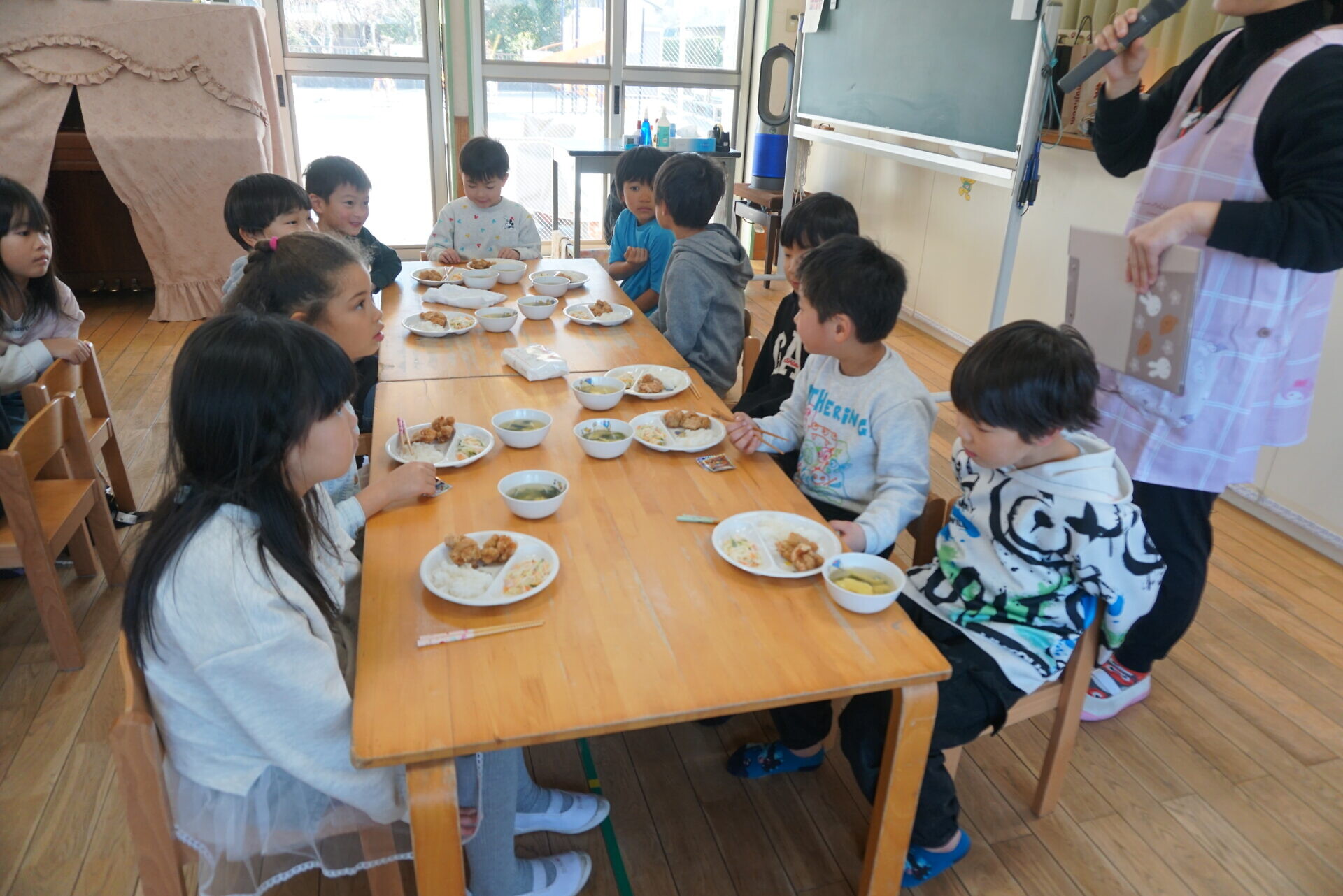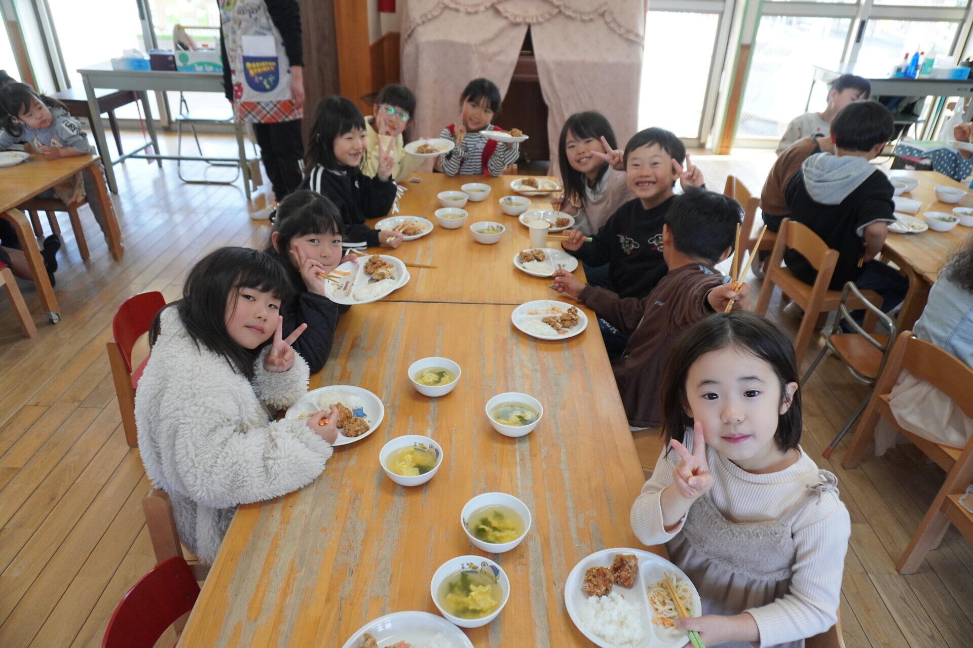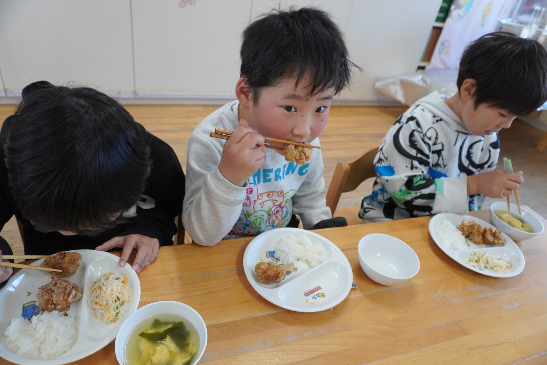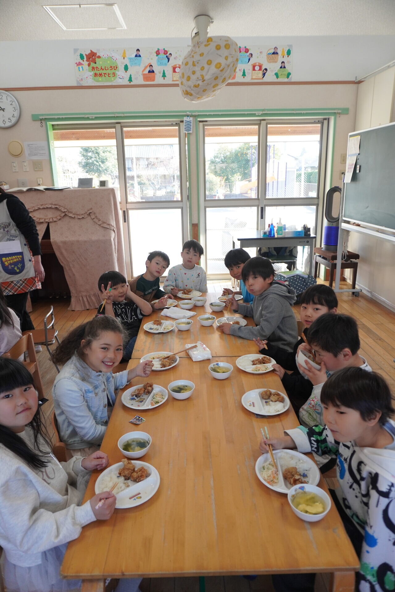 今回のメニューはみんなが大好きだったご飯、唐揚げ、シルバーサラダ、卵スープ、いちごでした