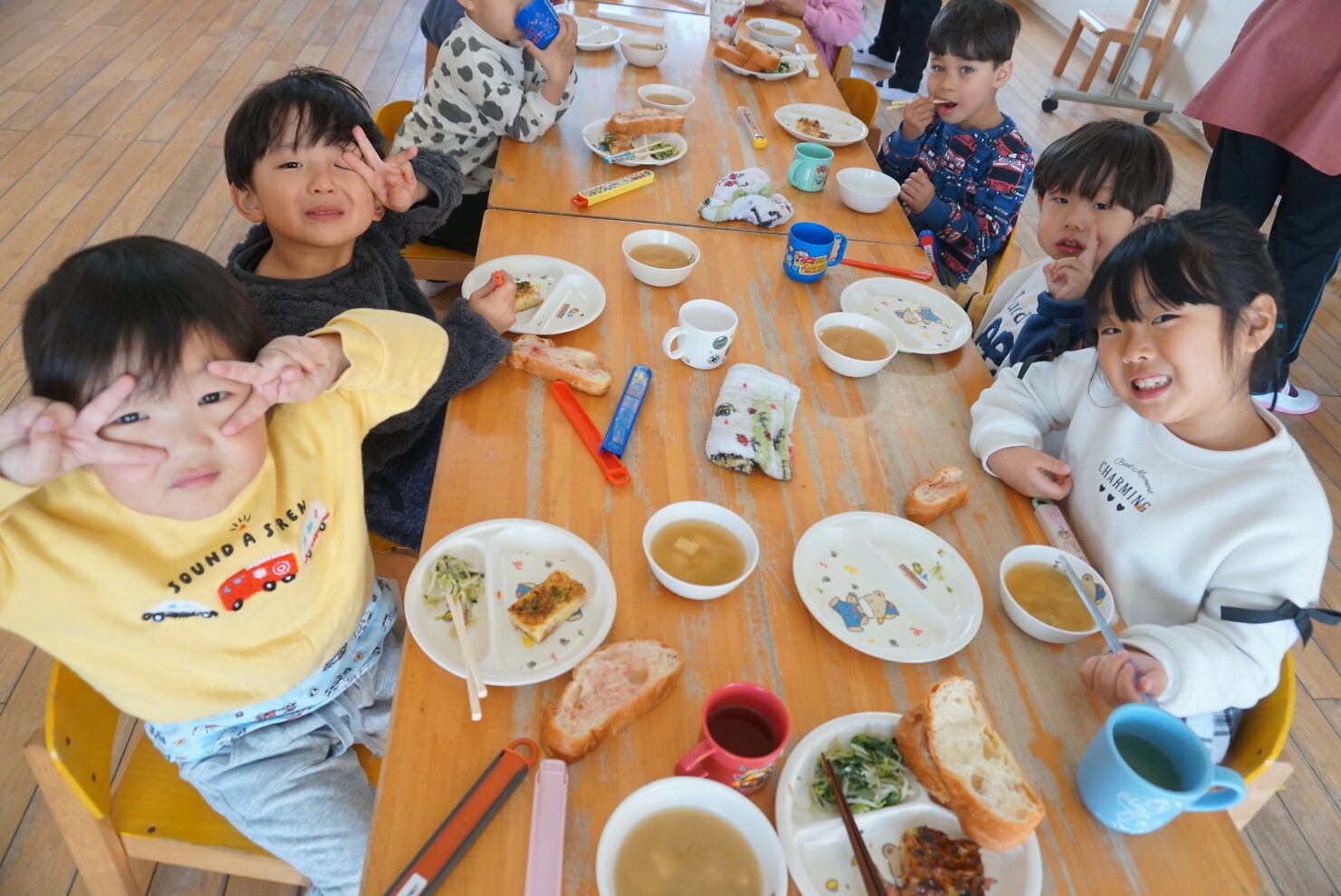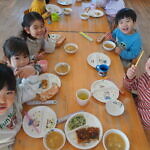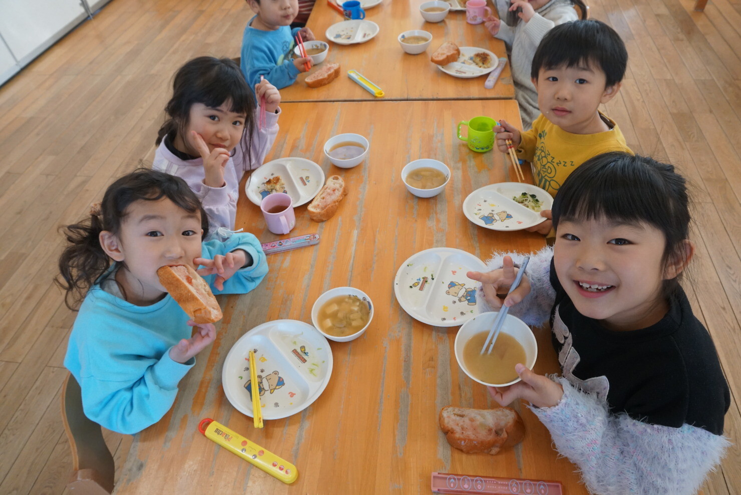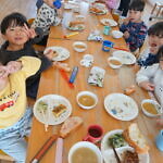 すみれ組はひまわり組をお手本に、ひまわり組はすみれ組の面倒を見ながら食べる姿にほっこりしました
