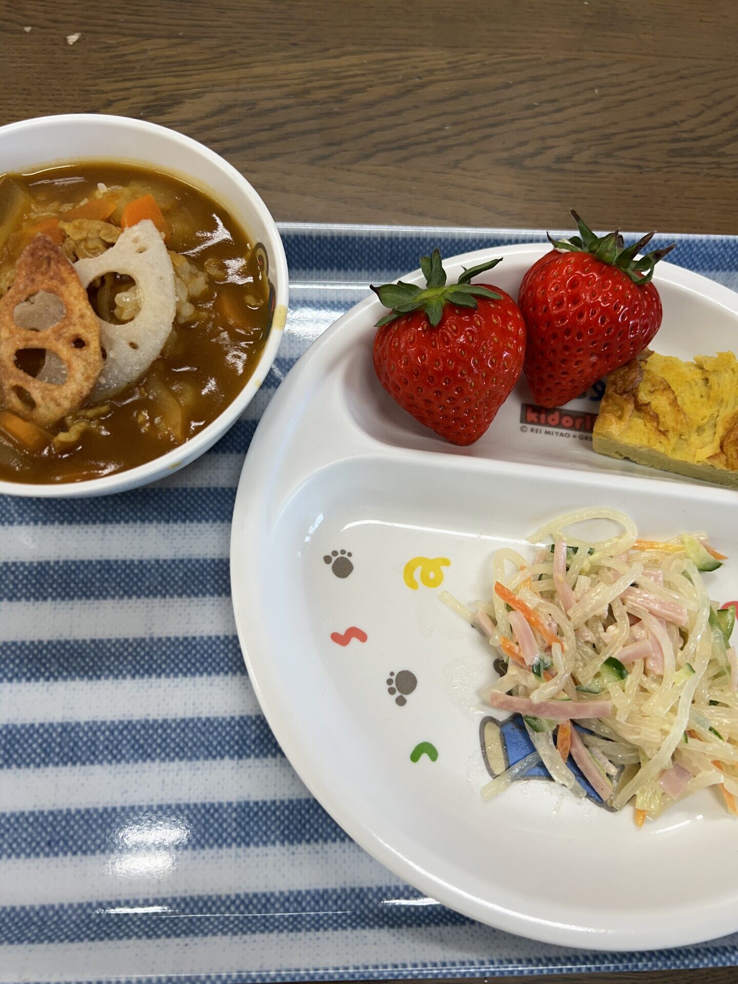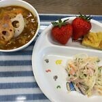 今回の給食は旬の野菜カレー、シルバーサラダ、卵焼き、いちごでした!!